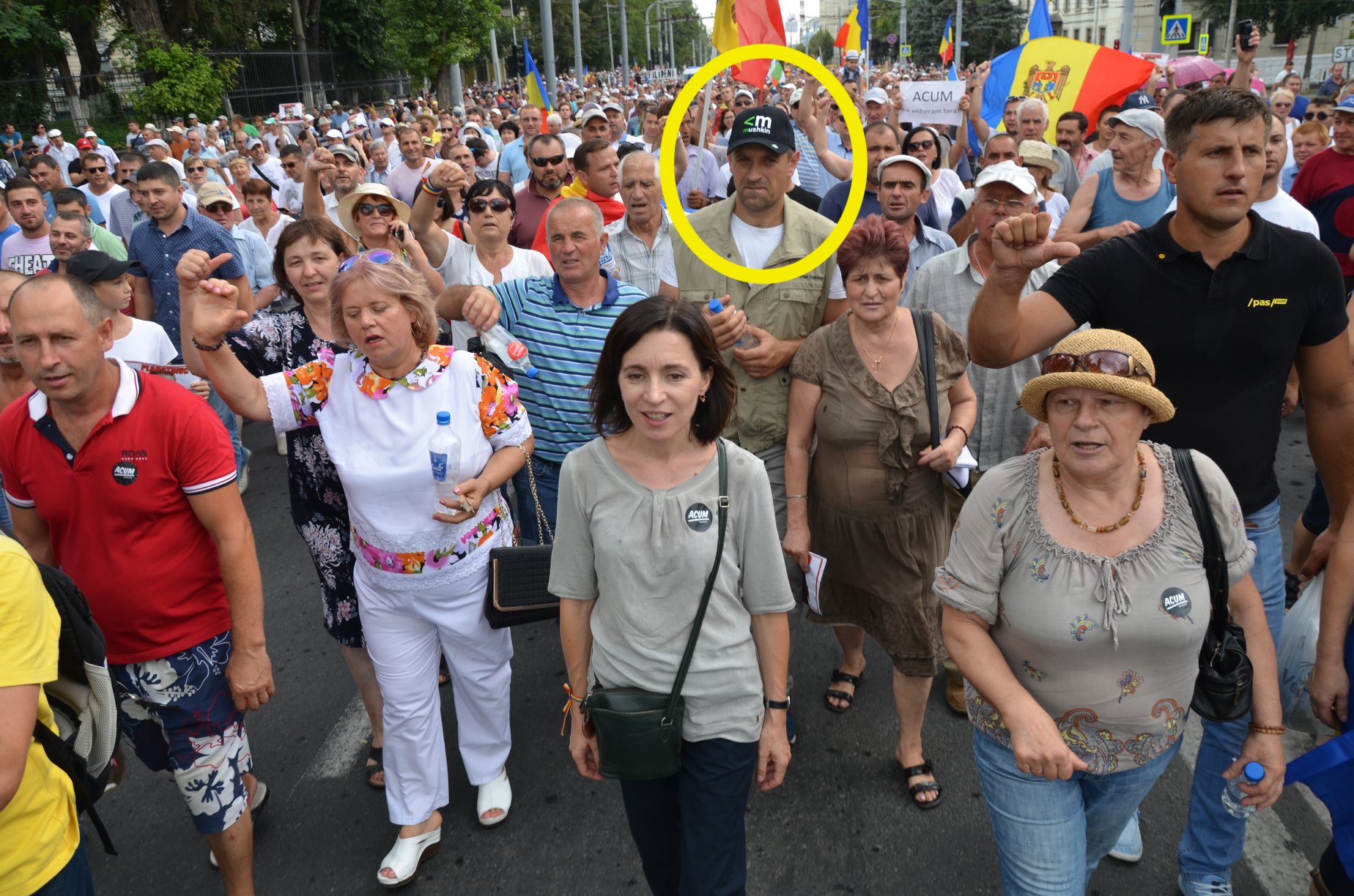 1 iulie 2018. Maia Sandu în cadrul marșului spre Plahotniuc. Însoțită deja de 3 bodyguarzi. Printre ei și Vasile Popa, dar și cel care avea gentuță în care, posibil, era pistol pe 26 august.