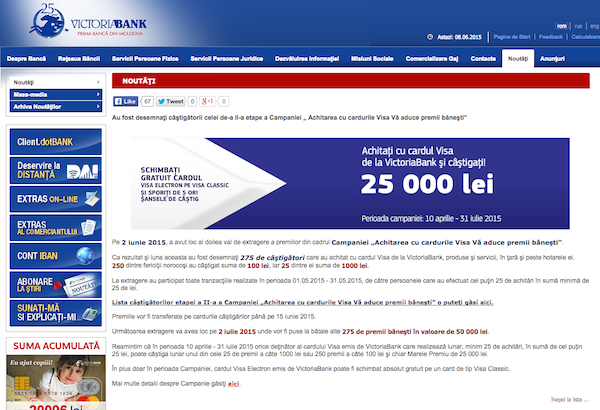VictoriaBank are un concurs. Pentru cei ce dețin Visa. Ideea este că trebuie să faci mai mult de 25 de tranzacții cu cardul Visa.
