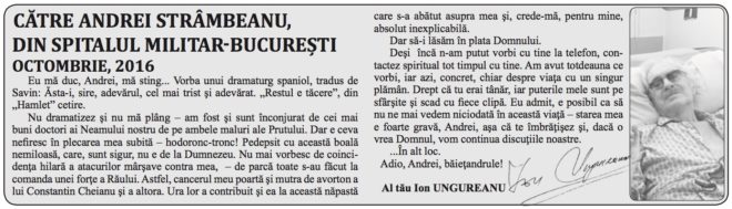 Ieri scriam pe facebook că exact un an în urmă publicam pe blog o scrisoare anonimă venită pe mail-ul redacțional din JurnalTV. Imediat după cineva foarte apropiat mi-a tranmis scanuri din nr. 13 al săptămânalului ”Literatura și Arta”, apărut la final de martie, cu o scrisoare a lui Ion Ungureanu către Andrei Strâmbeanu.