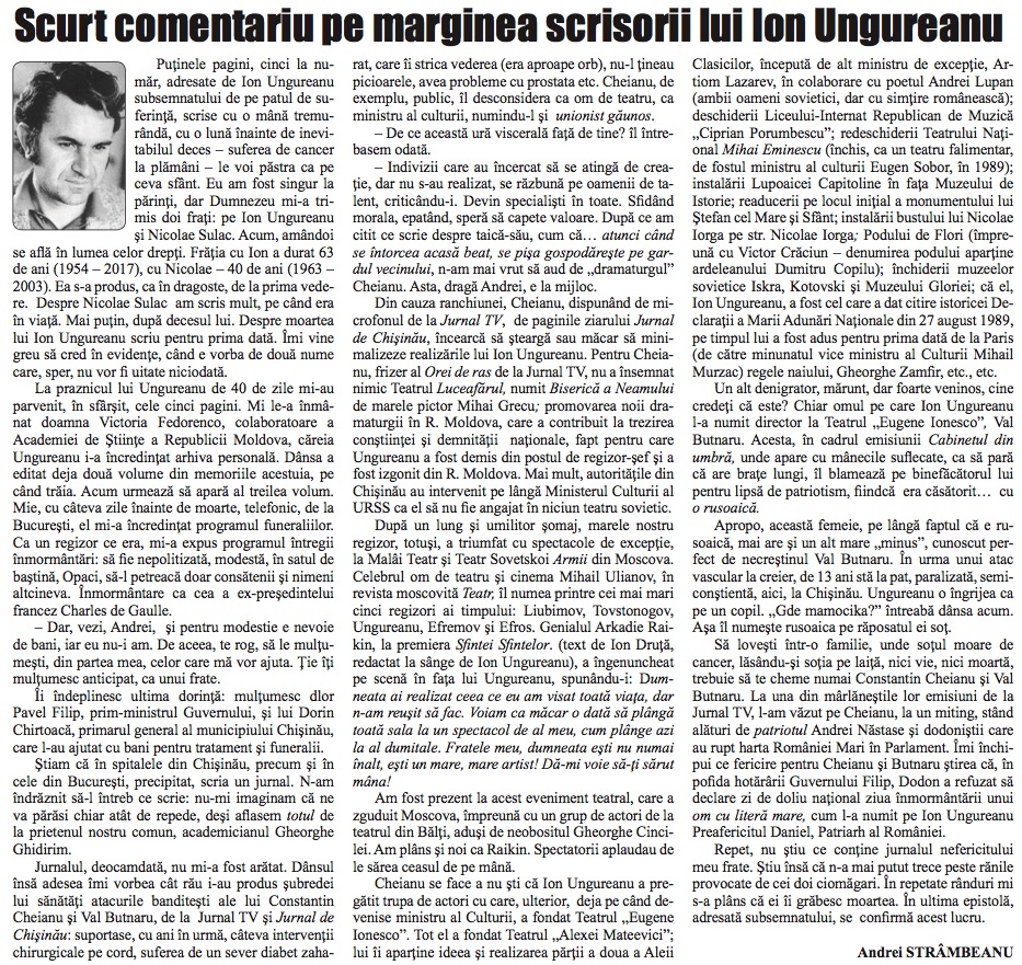 La praznicul lui Ungureanu de 40 de zile mi-au parvenit, în sfârşit, cele cinci pagini. Mi le-a înmânat doamna Victoria Fedorenco, colaboratoare a Academiei de Ştiinţe a Republicii Moldova, căreia Ungureanu i-a încredinţat arhiva personală. Dânsa a editat deja două volume din memoriile acestuia, pe când trăia. Acum urmează să apară al treilea volum. Mie, cu câteva zile înainte de moarte, telefonic, de la Bucureşti, el mi-a încredinţat programul funeraliilor. Ca un regizor ce era, mi-a expus programul întregii înmormântări: să fie nepolitizată, modestă, în satul de baştină, Opaci, să-l petreacă doar consătenii şi nimeni altcineva. Înmormântare ca cea a ex-preşedintelui francez Charles de Gaulle.