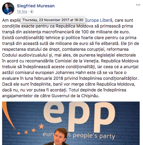 Da voi țineți minte cum urla pe la colțuri (a se citi – sponsored pe facebook) Mureșan despre faptul că Republica Moldova nu este un stat de drept și că guvernul de la Chișinău nu trebuie recunoscut și că nu merită deloc banii.